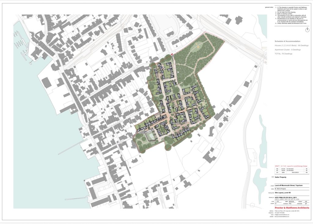 On 27.11.25, the Topsham Planning Panel had an online presentation with their London based architects. The information provided (site plans, access junction plans and a description of their design thinking) is below.