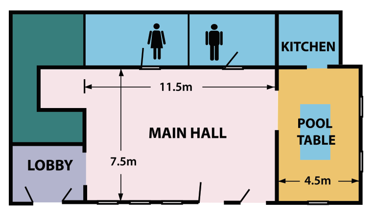 Dorothy Holman Centre is situated in Topsham Recreation Ground. It has a main hall, and a smaller area with a pool table and comfortable seating. There is a small kitchen with a fridge, tea and coffee making facilities. The Centre is a great venue for parties, community groups, meetings and exercise classes. For the dimensions of the building, please see the diagram on the right. The building has disabled access.